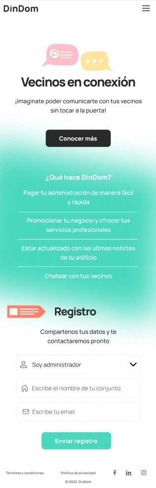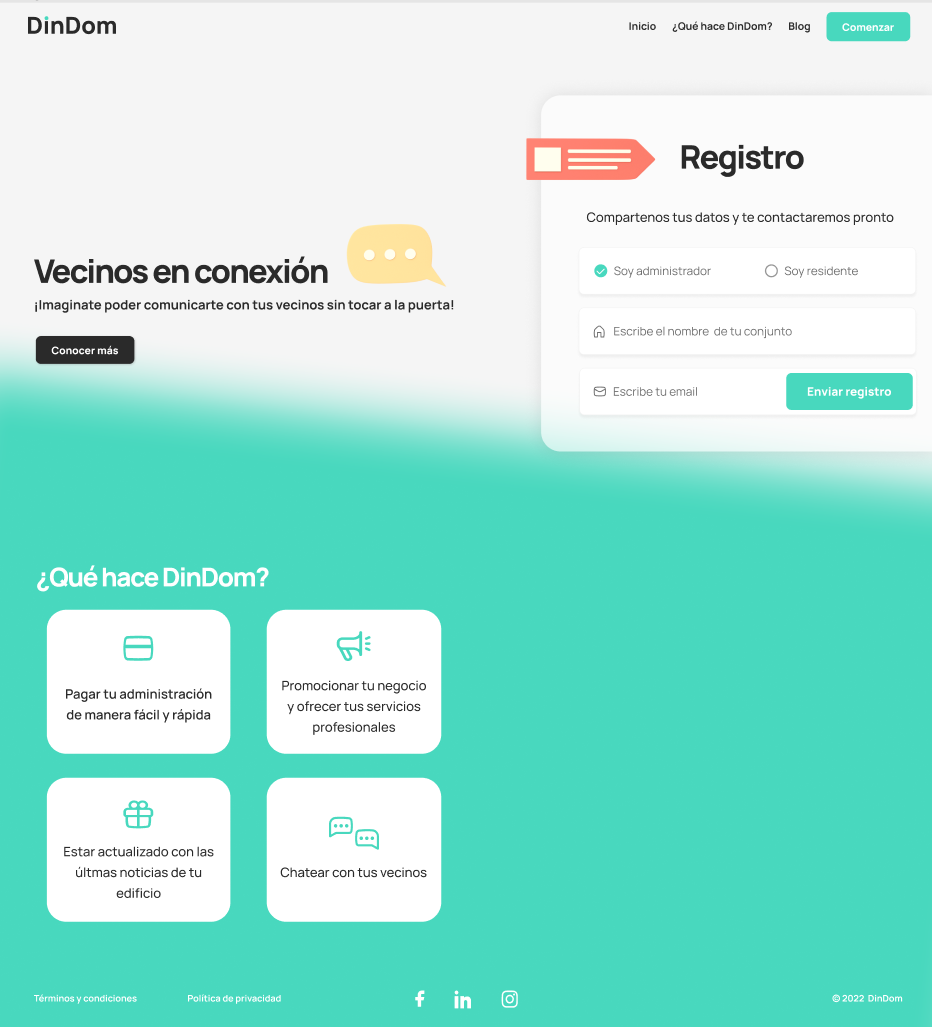 Compa帽铆a encargada de prestar servicios digitales con el fin de facilitar la gesti贸n a la propiedad horizontal, entre ellos pagos de administraci贸n, notificaci贸n de correspondencia, actualizaciones inmediatas de noticias del edificio, chat activo con los vecinos del conjunto, entre otros. Para esto se realiz贸 el desarrollo un landing page responsivo adicionalmente un aplicativo web y mobile gen茅rico que cumpliera con los requisitos planteados.